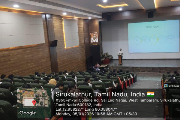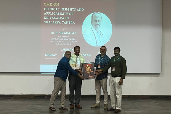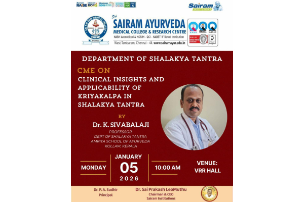 The Department of Shalakya Tantra, Sri Sairam Ayurveda Medical College & Research Centre, successfully organized a Continuing Medical Education (CME) programme titled “Clinical Insights and Applicability of Kriyakalpa in Shalakya Tantra” on Monday, 5th January 2026, at 10:00 AM in VRR Hall.