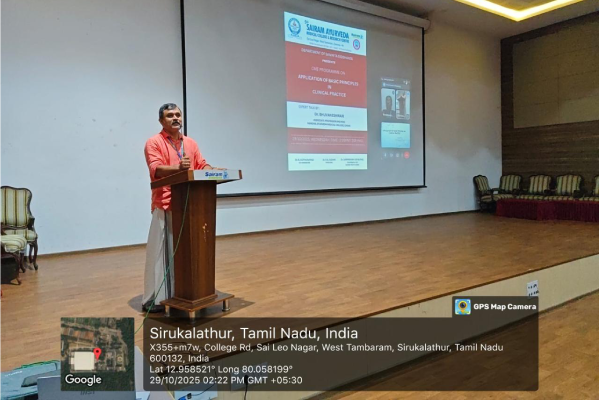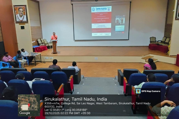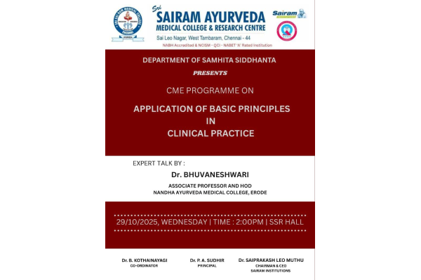 A Continuing Medical Education (CME) program on “Application of Basic Principles in Clinical Practice” was organized by the Department of Samhita Siddhanta, Sri Sairam Ayurveda Medical College and Research Centre, on 29.10.2025.