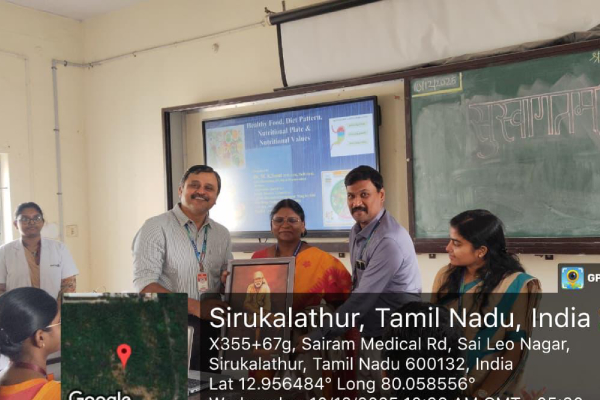 The session highlighted the significance of diet in health maintenance and disease prevention, with emphasis on scientific dietary principles and their application in clinical practice. Dr. M. K. Seeni shared valuable insights on nutrition, food quality, and regulatory perspectives related to diet and drugs, enriching the academic exposure of the students.