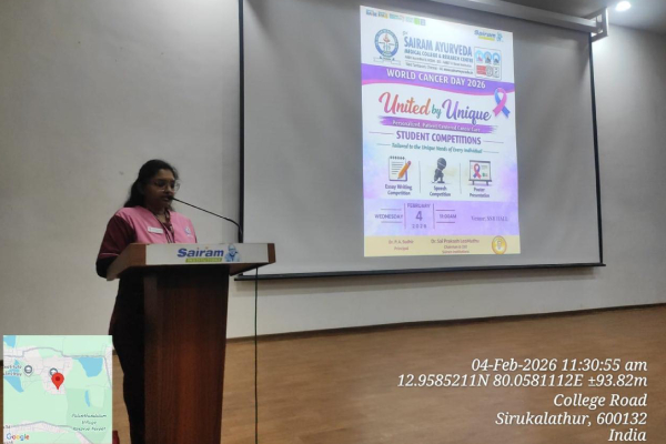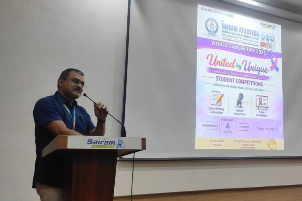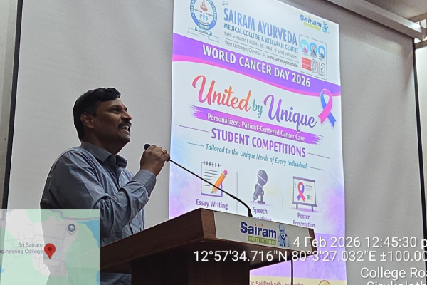 Sri Sairam Ayurveda Medical College & Research Centre observed World Cancer Day 2026 on 4th February 2026 (Wednesday) by organizing a series of student competitions under the global theme “United by Unique – Personalized, Patient-Centered Cancer Care.”